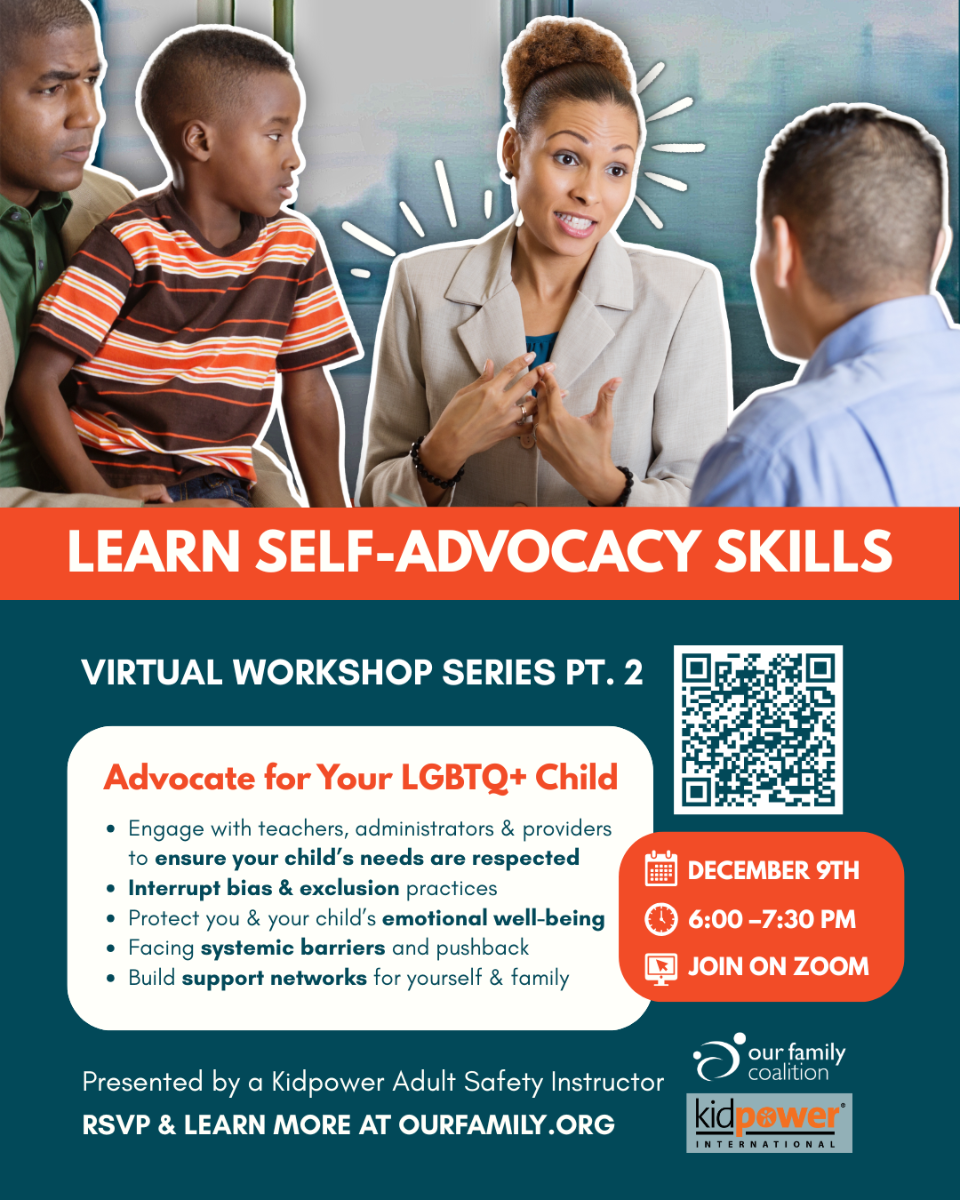In this workshop provided by KidPower (kidpower.org), learn how to effectively advocate for your LGBTQ+ child in schools, healthcare, and community settings. You’ll walk away with strategies that not only empower your child, but also strengthen your ability to navigate difficult systems and conversations on their behalf.
